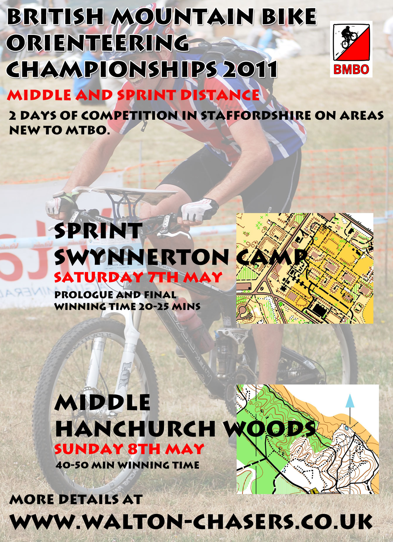 British MTBO Champs WeekendMay 8, 2011 Middle Champs results here Middle Champs Splitsbrowser Prologue (and kids) results here Sprint Prologue Splitsbrowser here Final Results here Sprint Final Splitsbrowser here RouteGadget for both days here http://www.walton.routegadget.co.uk/walton/reitti.cgi